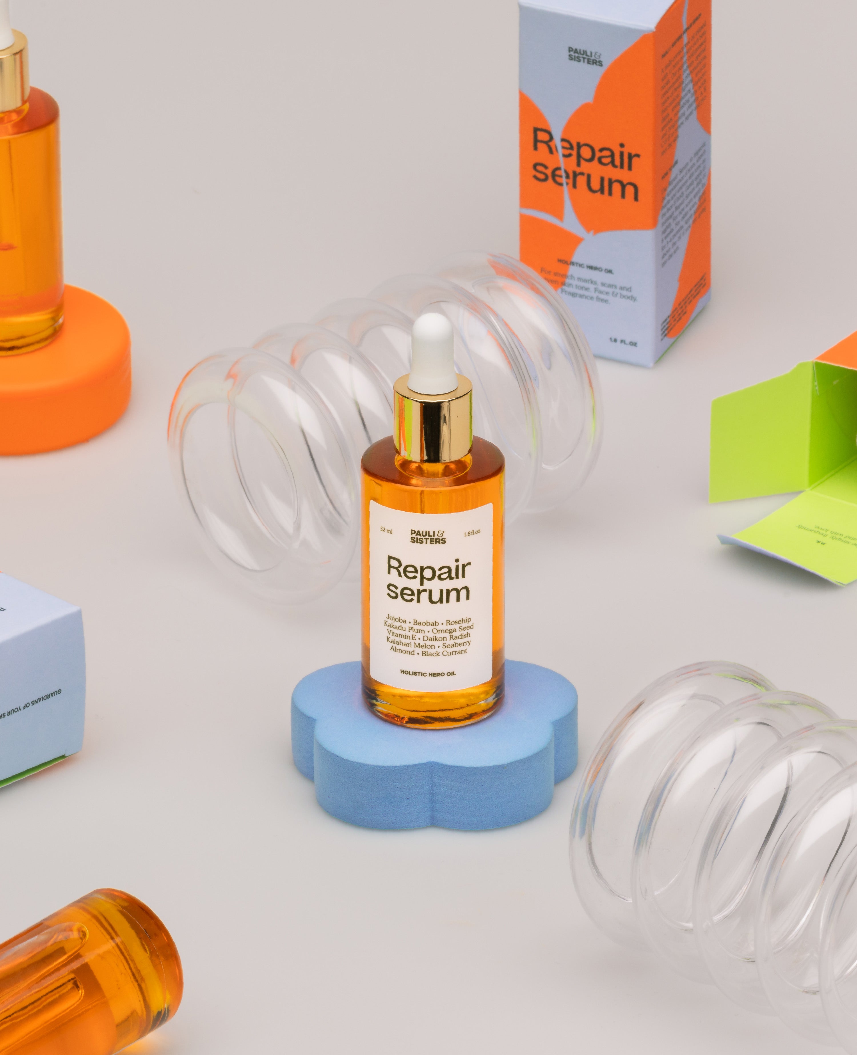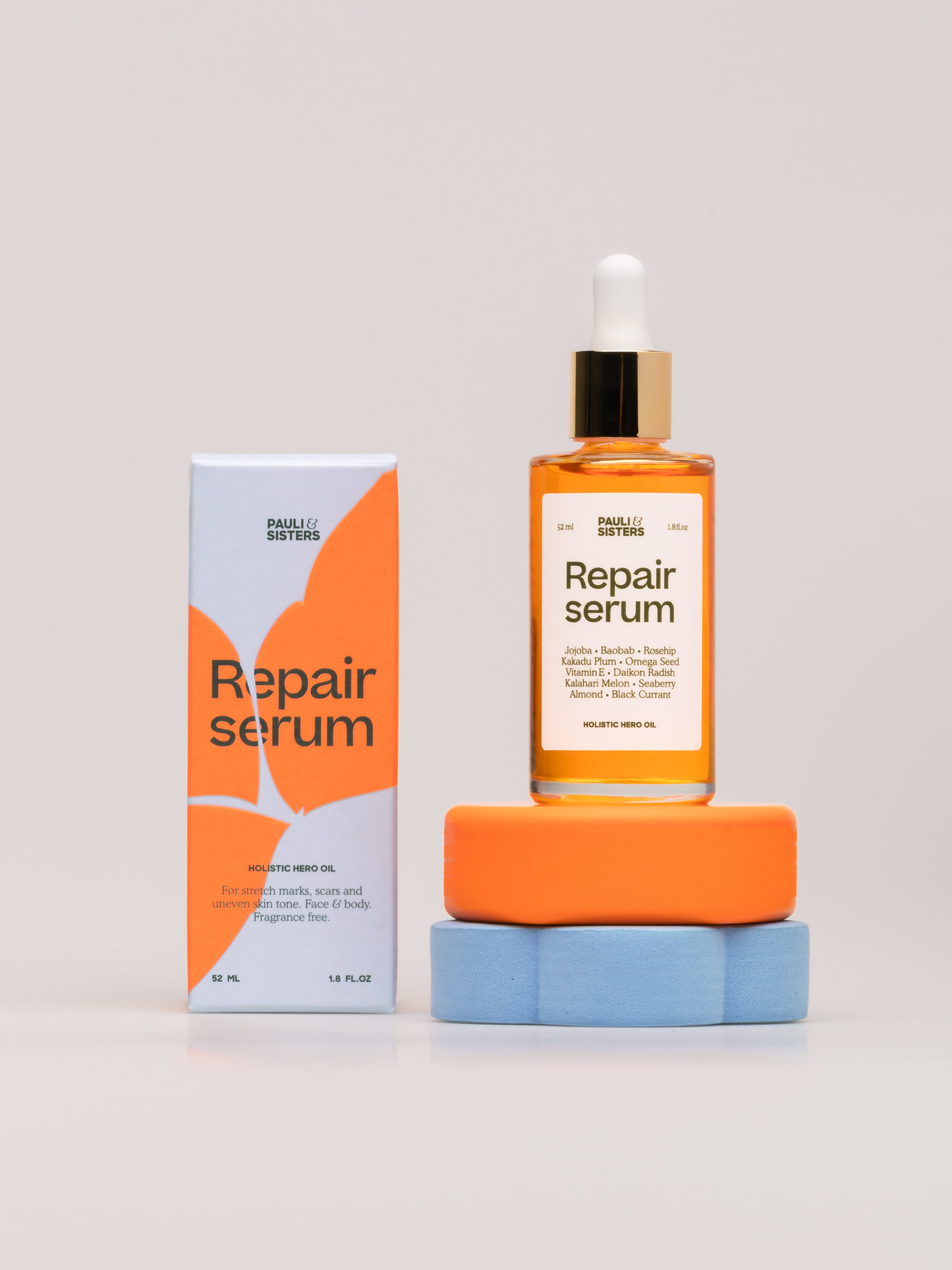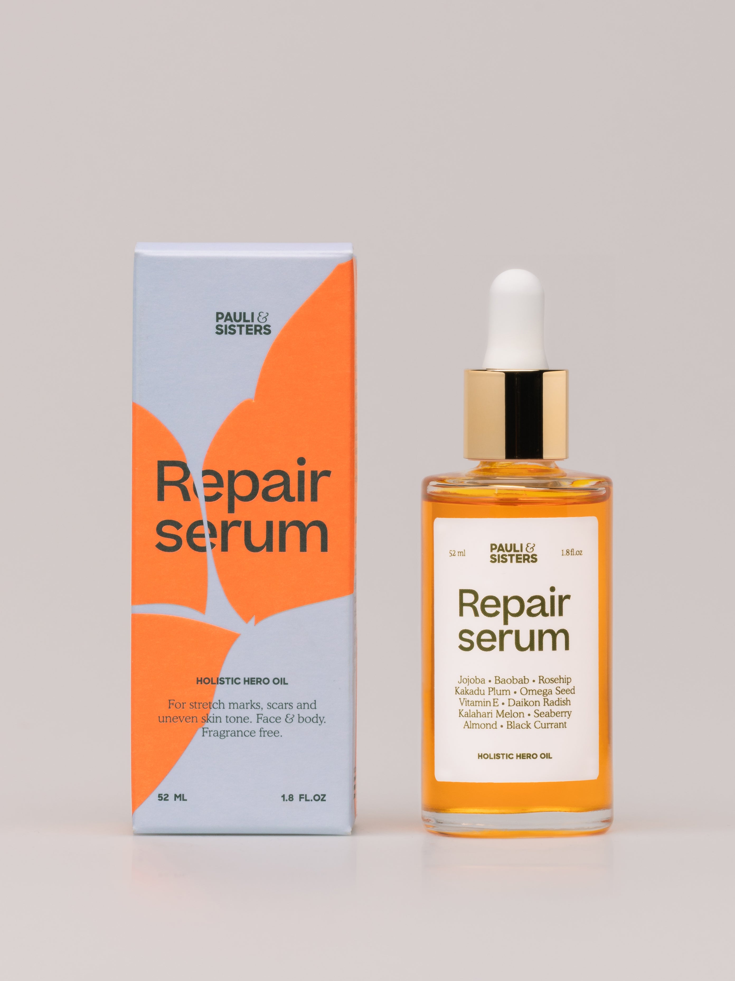 Pauli & Sisters Repair Serum is a powerful, multi-correctional oil infused with 11 hero nutrient-rich botanicals. Each of our hero ingredients serves its own purpose. The infusion of all 11 are made to repair your skin of stretch marks, scarring, uneven skin tone and more. Our potent cold-pressed concentration delivers optimal ratios of healing phytonutrients, free-radical fighting antioxidants, strengthening phytoceramides, nourishing fatty acids, and brightening vitamins to renew, repair, and protect the skin.